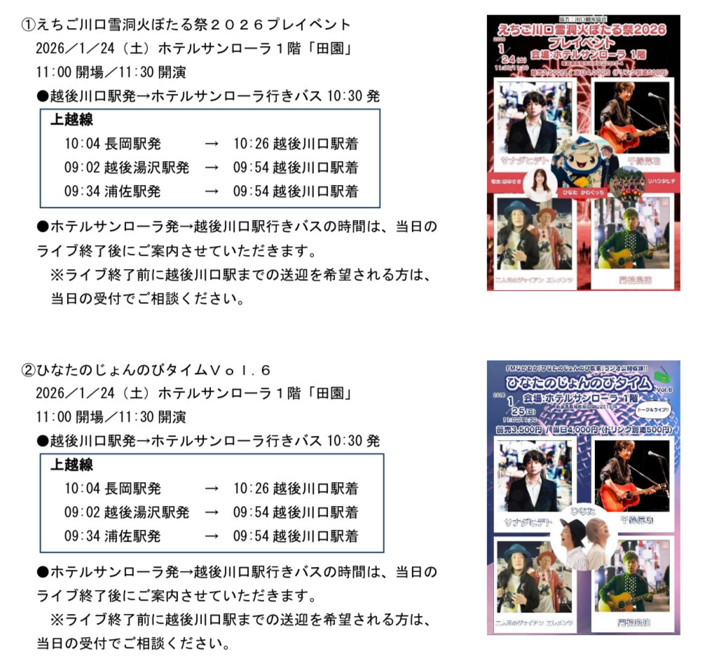 ライブ会場「ホテルサンローラ」へ、最寄り駅の「JR越後川口駅」から往復無料送迎バスへの乗車をご希望される方はチケット予約後メールにてお申込ください。